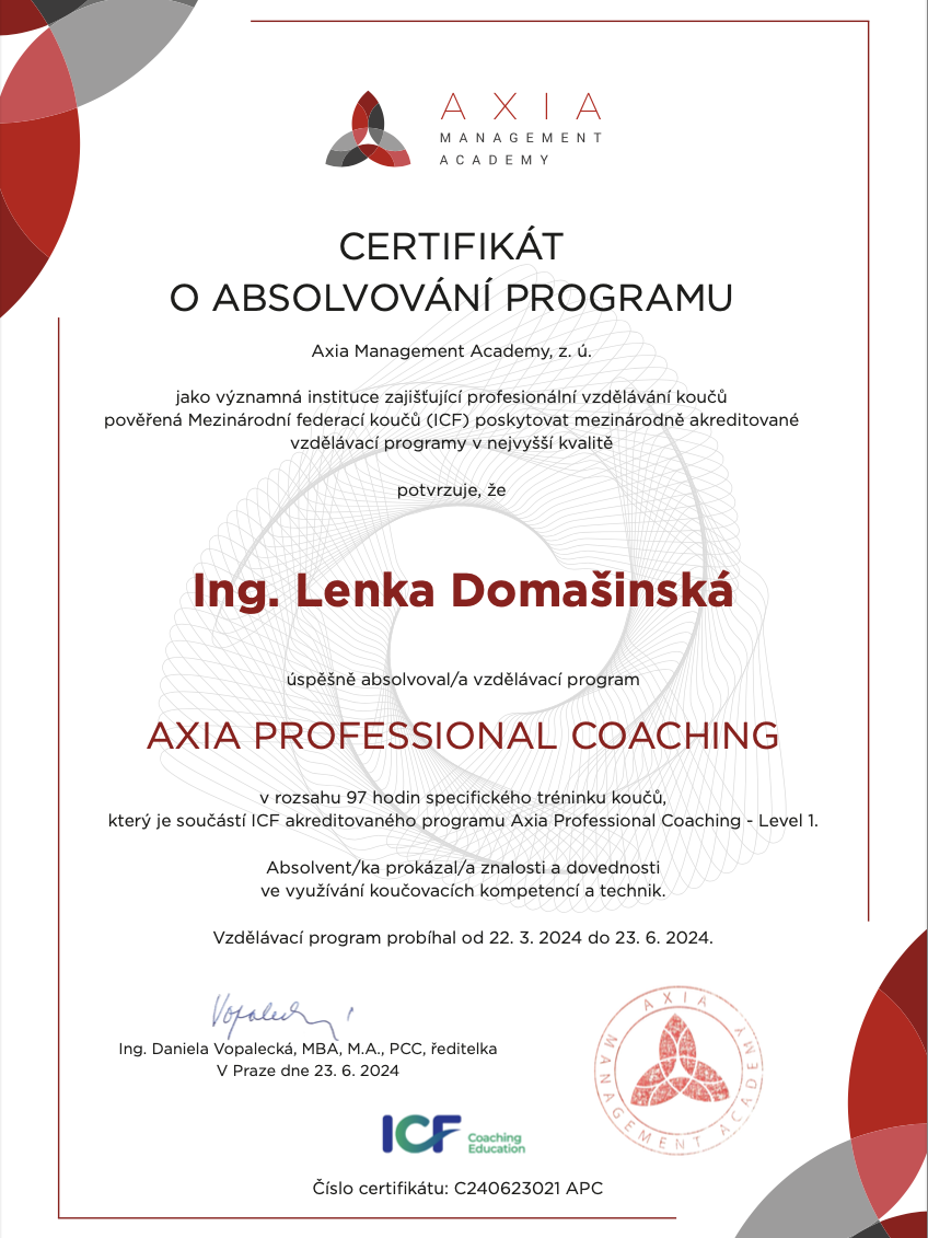 Absolvovala jsem ICF akreditovaný výcvik profesionálního koučování, který je klíčový pro udržení kvality mých služeb. Zároveň jsem držitelkou certifikátu – NLP Practitioner – v koučování tak umím nabídnout různé techniky na podporu celého procesu.